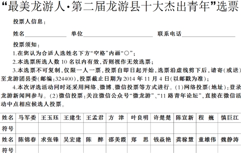为深入学习贯彻党的十八大、十八届四中全会精神,贯彻落实市委六届四次全会和县委十届六次全会精神,宣传和弘扬社会主义核心价值观,挖掘、树立、宣传一批充满活力朝气、具有时代特征的青年榜样,激励全县广大青年把个人梦想与“中国梦”紧密结合起来,将自己的成长成才与龙游“两化”引领、创新实干的实践结合起来,为开创龙游科学跨越发展新局面贡献青春力量,决定在全县开展寻找身边的青春榜样暨“最美龙游人·第二届龙游县十大杰出青年”评选活动。根据县委宣【2014】25号文件要求,经主办单位审定及相关单位复核,现将20名正式候选人名单及简要事迹公布如下(按姓名笔画排序)。请广大市民积极参与,评选出您心目中的“十大杰出青年”。