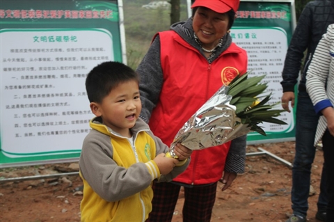 4月4日清晨,“龙游大妈”队伍7点40分到达县公墓园,民政局、义工服务队、殡仪馆的工作人员已忙着搬鲜花、支帐篷。在公墓入口,大妈们耐心地劝导着前来祭扫的市民,并用鲜花换取他们手中的鞭炮。许多市民很愿意听从和配合大妈们的劝说,但依然有人藏匿鞭炮,拒绝劝导。