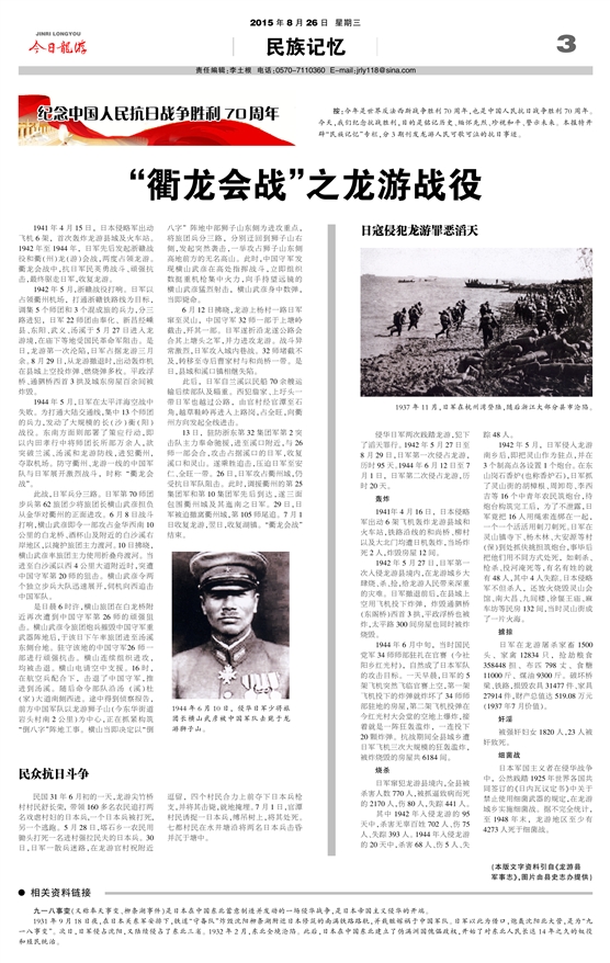 侵华日军两次践踏龙游,犯下了滔天罪行。1942年5月27日至8月29日,日军第一次侵占龙游,历时95天。1944年6月12日至7月1日,日军第二次侵占龙游,历时20天。