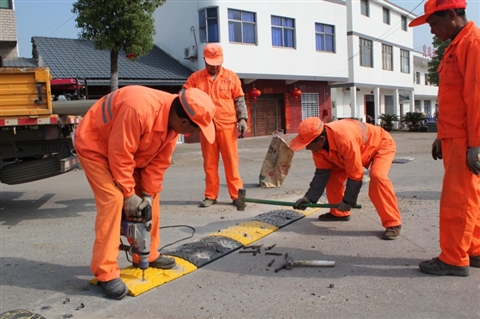 由于长期受车辆制动时的摩擦及冲击,一些安装于路口的减速带出现了磨损及缺失现象,失去了正常的减速功能。连日来,县公路管理局组织人员对所辖路段减速带进行全面维修,并在部分路口增设了减速带,以消除道路事故隐患。图为3月27日,320国道祝家路段,公路养护人员正在更换减速带。